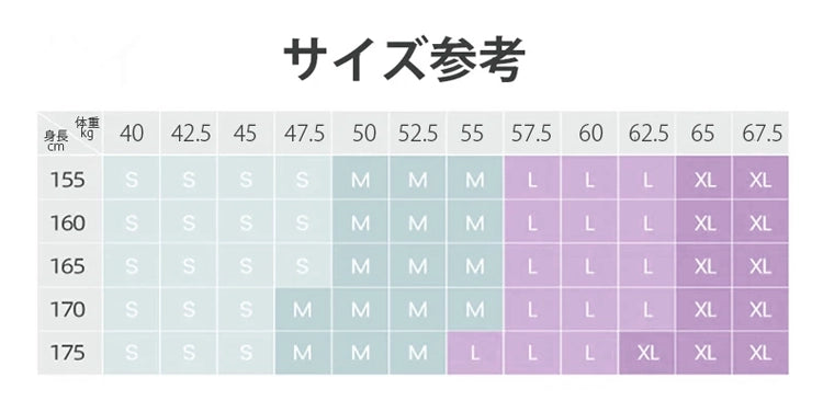 A: 商品ページにサイズ目安表がありますのでご参考ください。こちらに直接お問合わせていただいても大丈夫です。