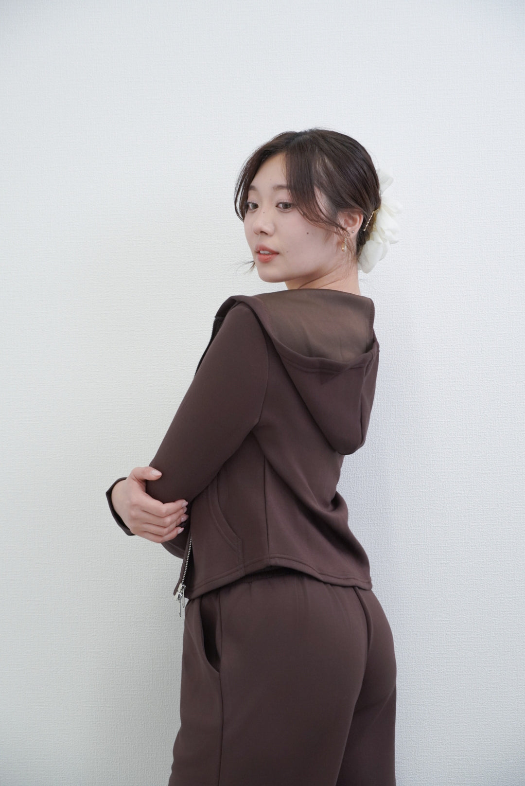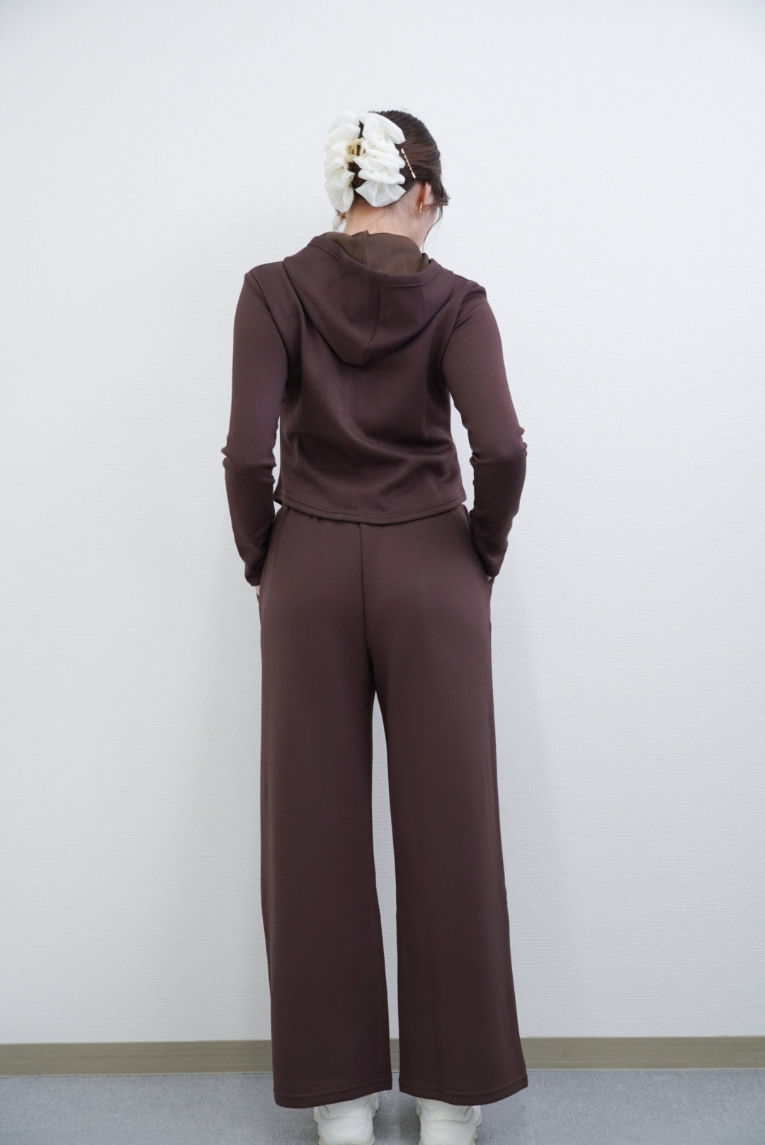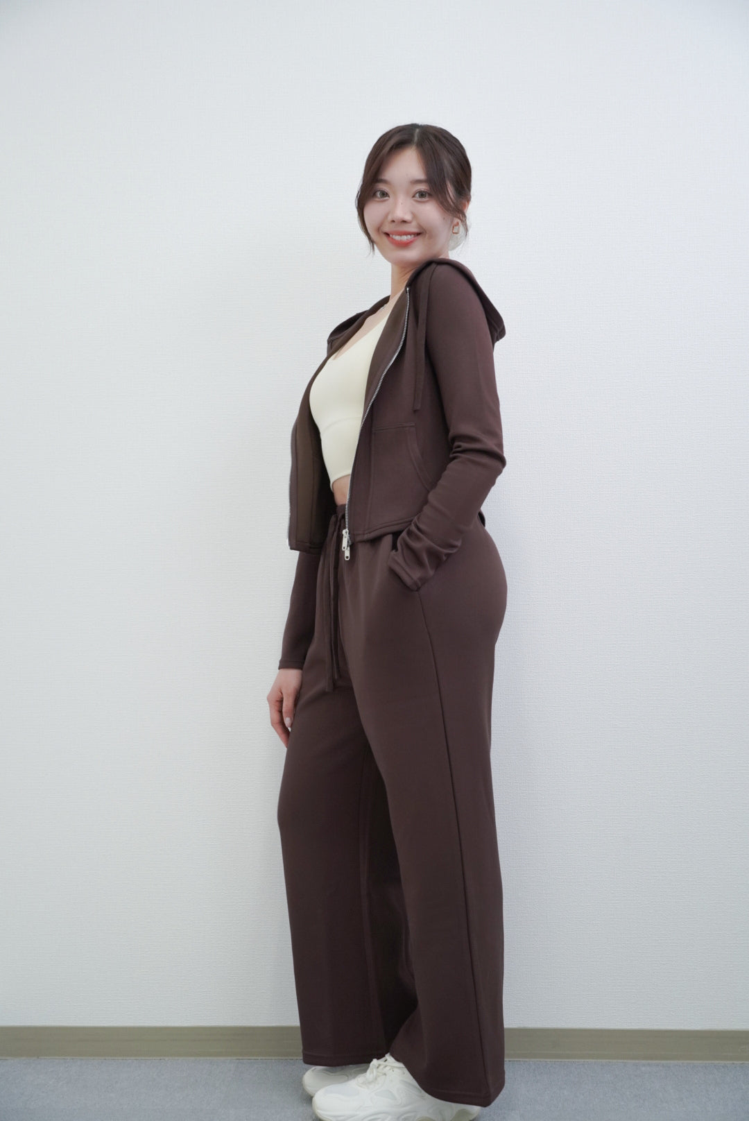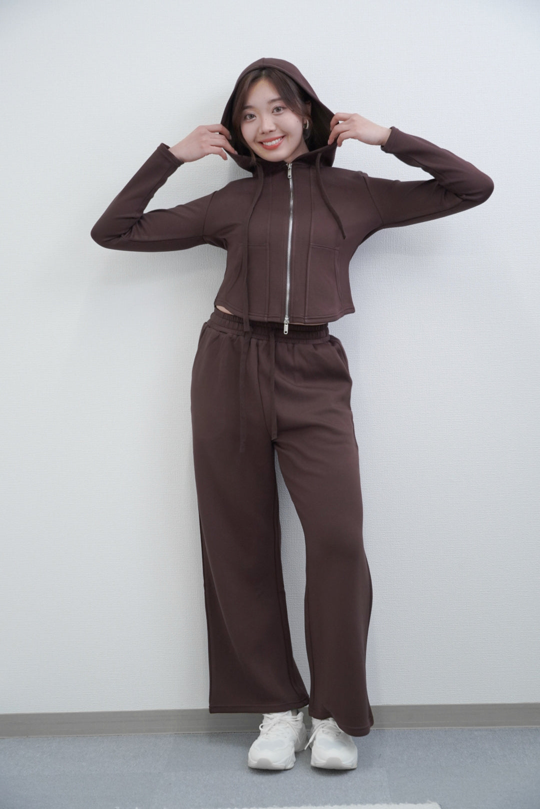 パーカーのセットアップ肌触りがとにかく最高!トップスはウエストマークされてて、パンツがストレートだから、自然とスタイルアップして見えるセットアップ!