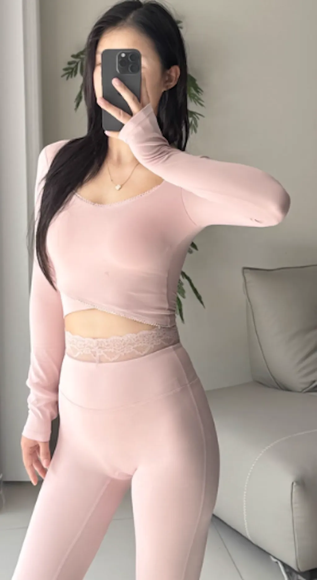 • 親指を通せるサムホール仕様で、ポーズ中も袖がずれ落ちず快適。様々な動きにもぴったりフィットし、集中力もアップできる。