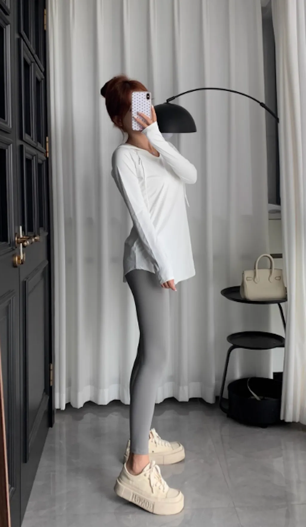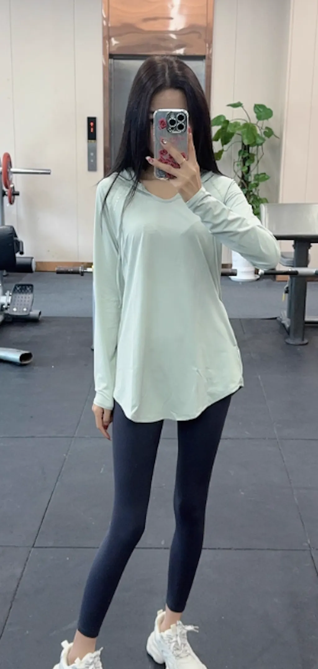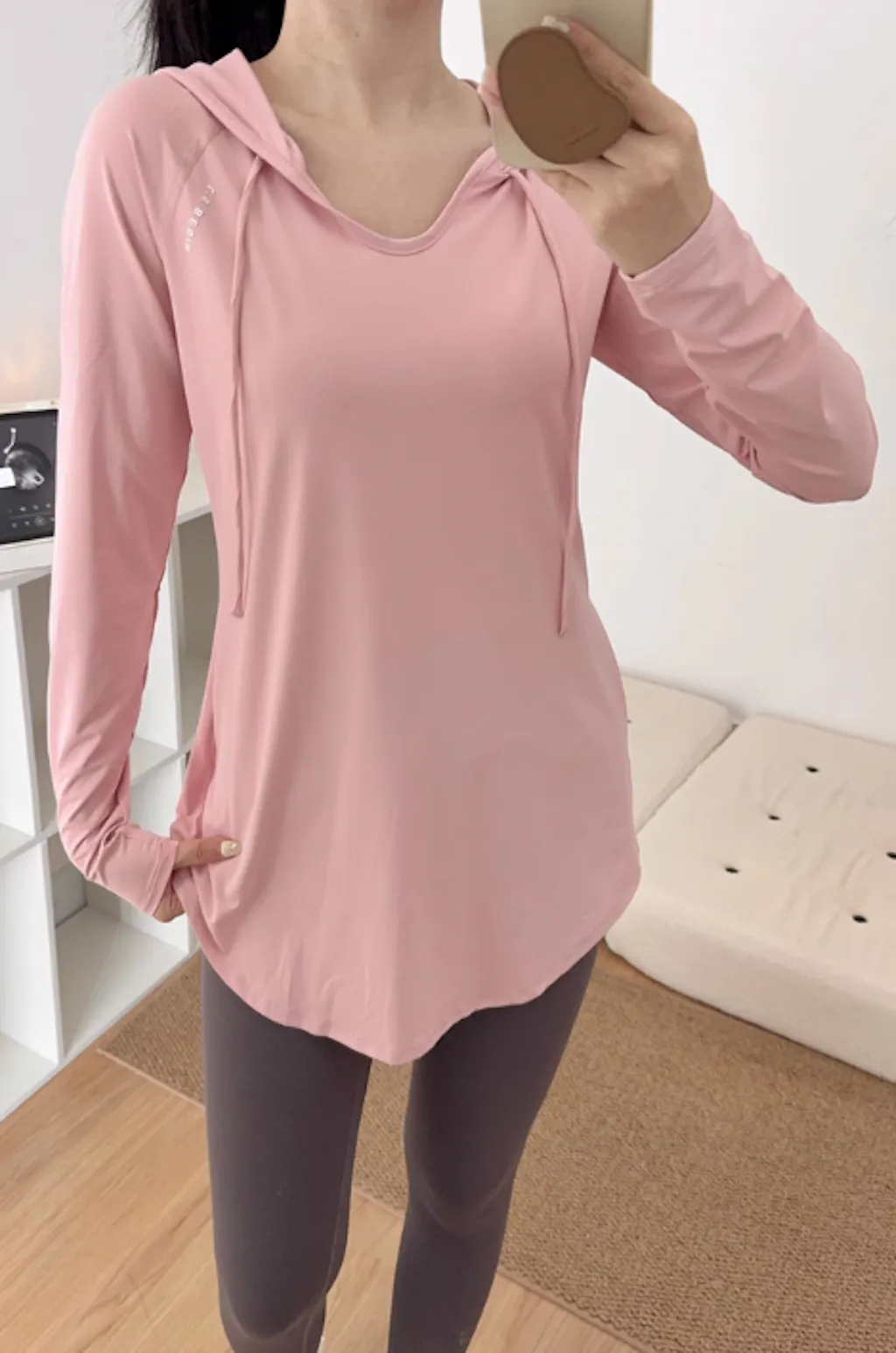 - レギンスと合わせるとヒップをカバーでき、絶妙な丈間を与える。深すぎないVネックで首が長く見える効果が期待できます。