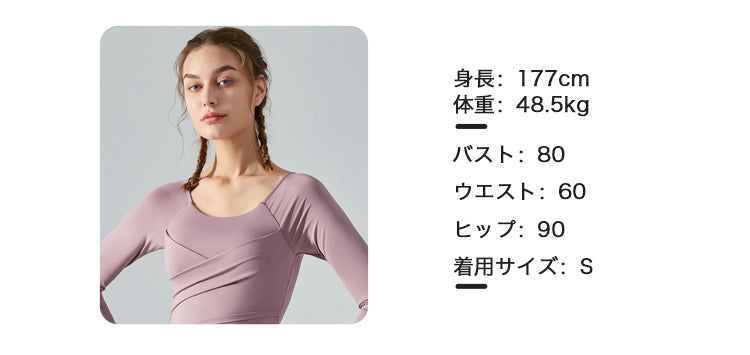 - 首元も綺麗なデコルテラインを見せられる開きになっており、スタイリッシュで美しく見せることができます。逆転のポーズでもめくれず安心感があります。