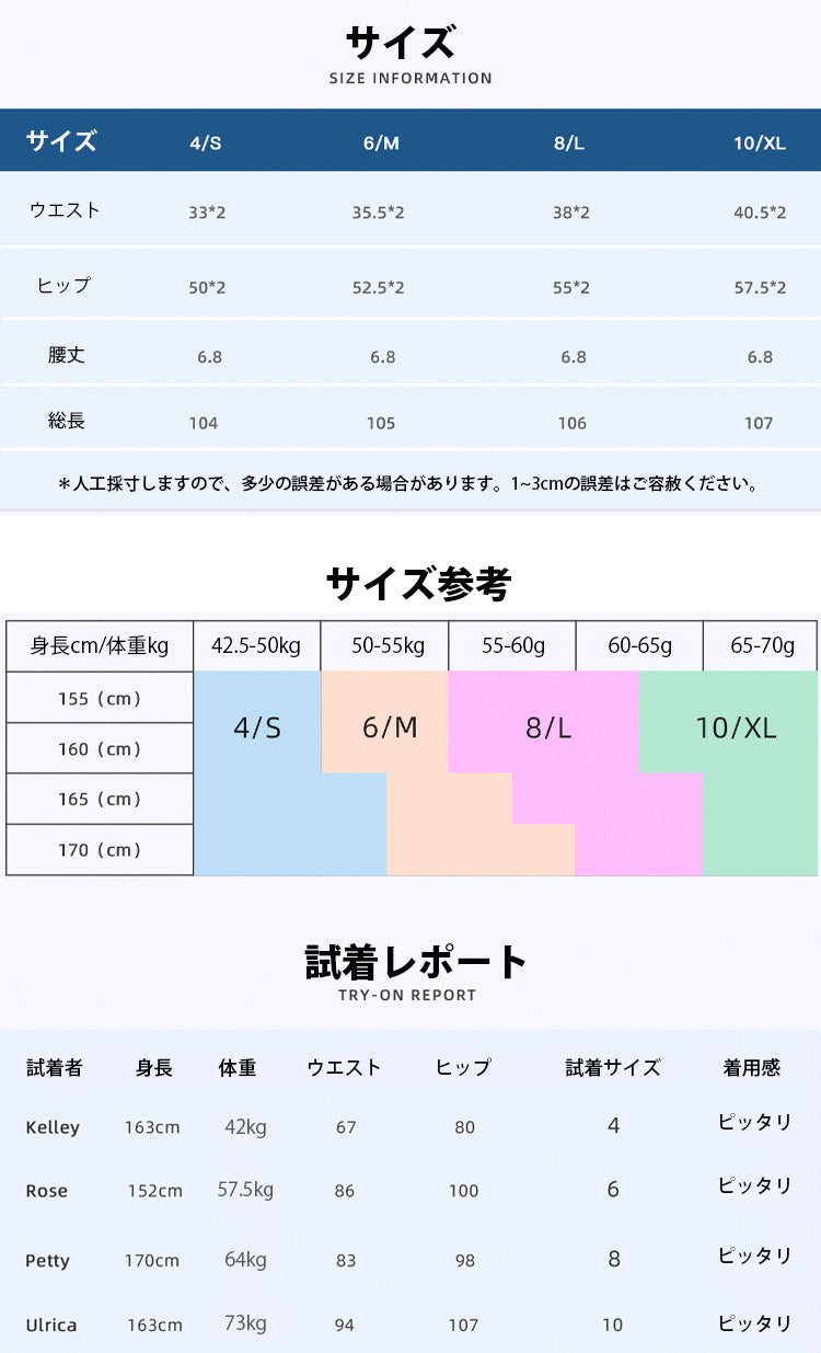 A: 商品ページにサイズ目安表がありますのでご参考ください。こちらに直接お問合わせていただいても大丈夫です。
