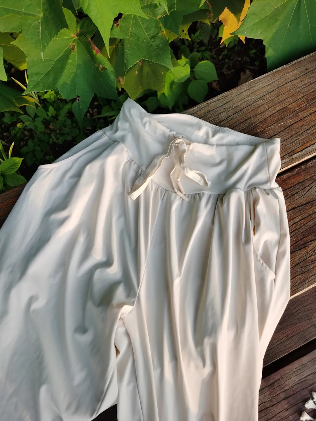 - 紐付きデザインで、自由にサイズ調整可能なカジュアルパンツ。