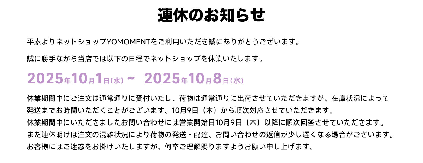 商品の管理、発送には細心の注意を払っておりますが、万一「不良品(破損、汚損など)」「商品違い」「数量違い」がございます場合は、当方送料負担で交換または返品対応いたします。その場合は大変お手数ですが、商品受取後14日以内にお問い合わせもしくはinfo@yomoment.comまでご連絡ください。三日(祝日除く)以内に担当者から折返しお返事いたします。キャンペーン前後お問い合わせが多い時返信遅くなる場合がございます。