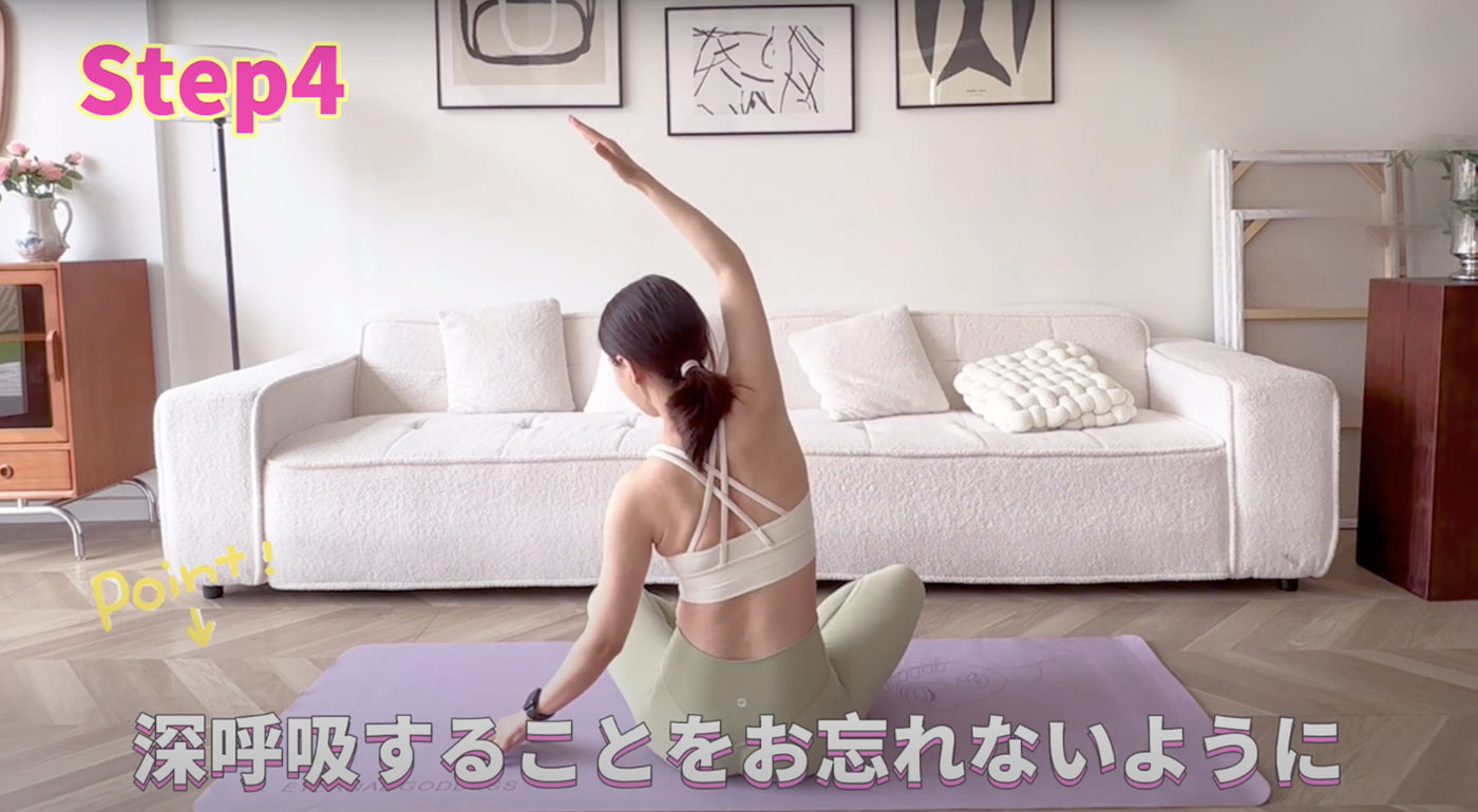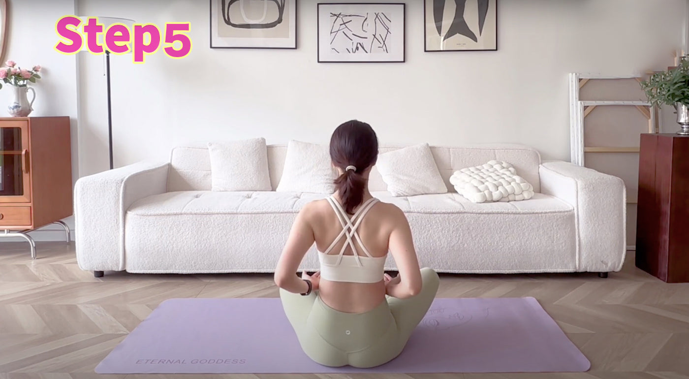 準備:まずヨガマットにあぐらをかいて座りましょう。