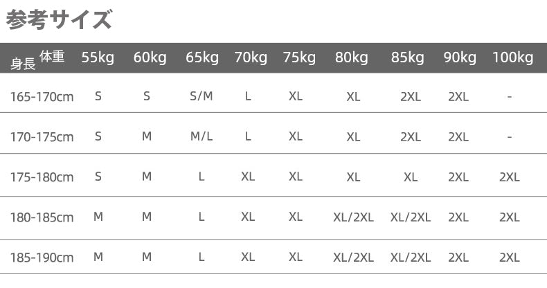 A: 商品ページにサイズ目安表がありますのでご参考ください。こちらに直接お問合わせていただいても大丈夫です。