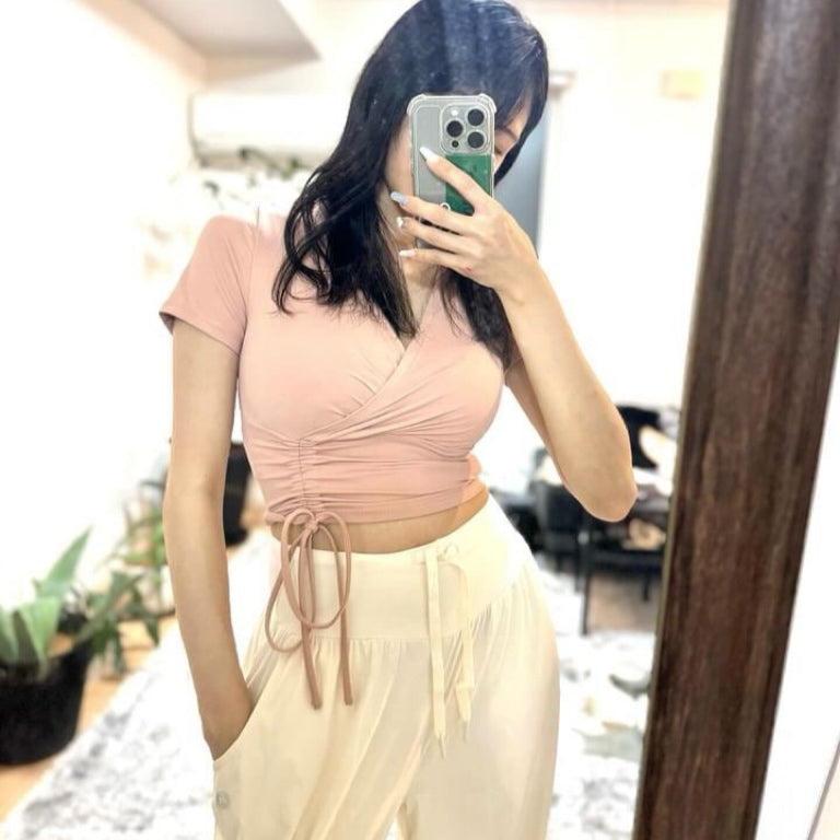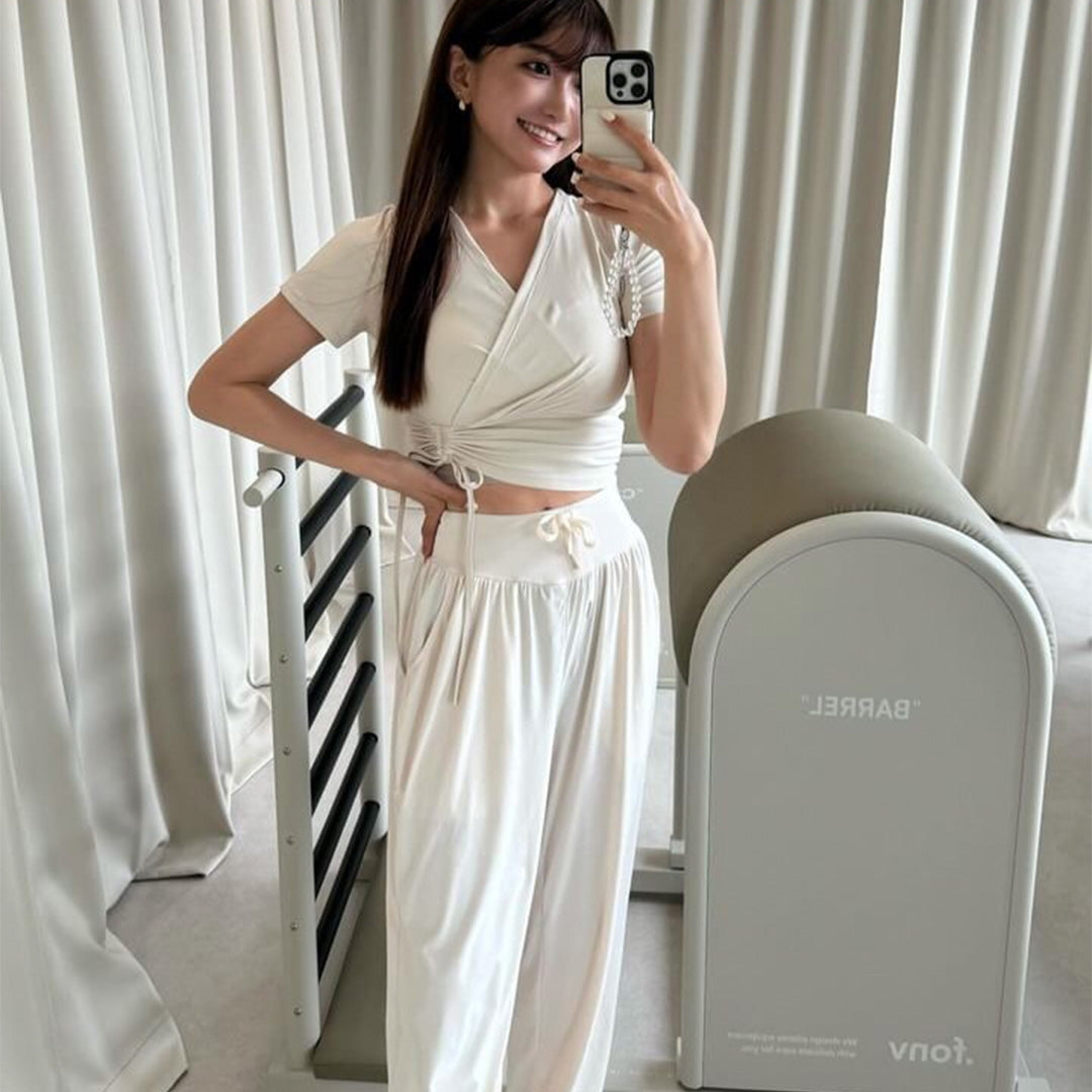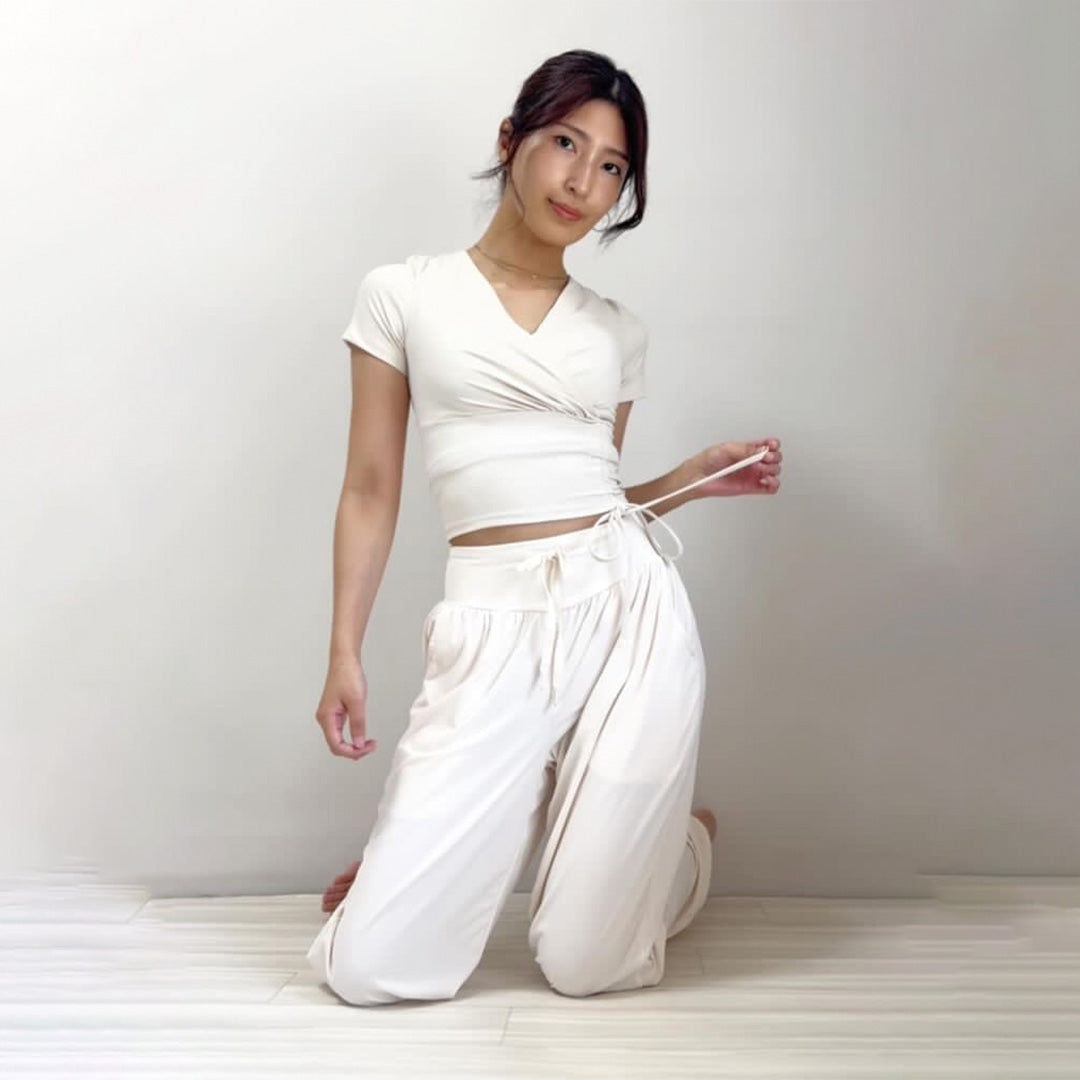 - 紐付きデザインで、自由にサイズ調整可能なカジュアルパンツ。